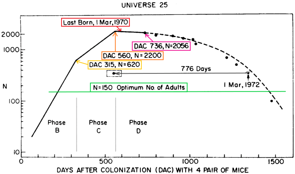 Am Tag 315 waren es nun 620 Mäuse. Die Population verdoppelte sich jetzt nur noch alle 145 Tage. Calhoun erklärte den Geburtenrückgang wie folgt. Normalerweise wandert der Überschuss ab, der keine sozialen Nischen mehr findet. In seinem experimentellen Universum gab es jedoch keine Gelegenheit zur Auswanderung. Als die ungewöhnlich vielen Jungen das Erwachsenenalter erreichten, mussten sie bleiben, und sie kämpften um Rollen in dem gefüllten sozialen System. Männchen, die versagten, zogen sich physisch und psychisch zurück; sie wurden sehr inaktiv.
