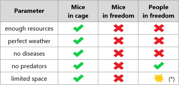 Why can’t the mouse cage be transferred 1:1 to free humans? The answer is quite simple. Because WE do not have unlimited resources at our disposal. I have tried to illustrate the differences between experiment and reality in a table.