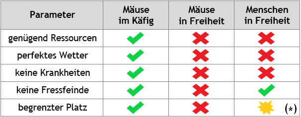 Warum kann man den Mäuse-Käfig nicht 1:1 auf den freien Menschen übertragen? Die Antwort ist ziemlich einfach. Weil UNS nicht unbegrenzte Ressourcen zur Verfügung stehen. Ich habe versucht, die Unterschiede zwischen Experiment und Realität in einer Tabelle zu verdeutlichen.