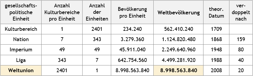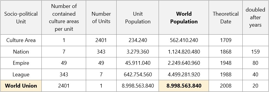 Den Zusammenschluss von SIEBEN „Kulturbereichen“ nennt er „Nation“. Aus SIEBEN „Nationen“ entsteht ein „Imperium“. Aus SIEBEN „Imperien“ entsteht eine „Liga“. Und SIEBEN „Ligen“ gipfeln in einer „Weltunion“. Diesen Prozess hat er in der folgenden Tabelle zusammengefasst.