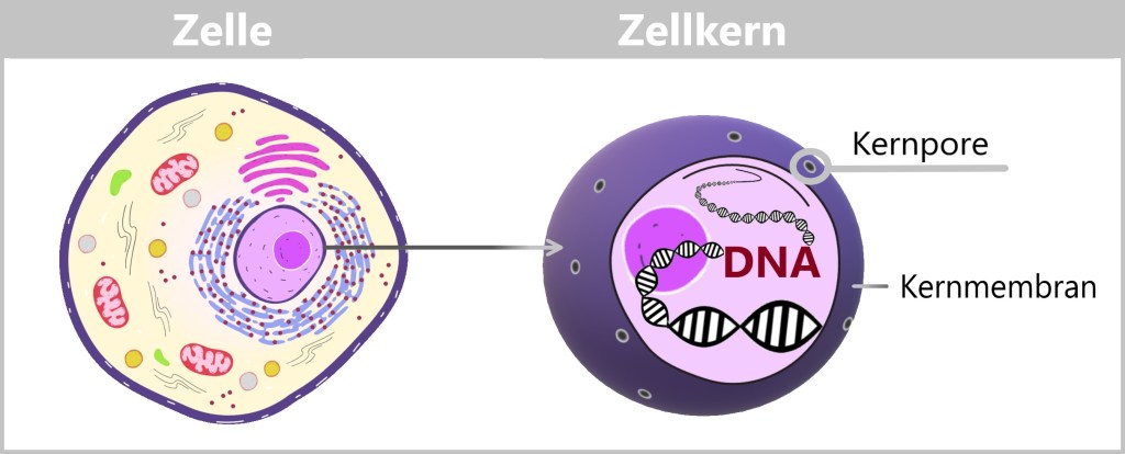 Zellkern: Der Zellkern (Nukleus) speichert die genetische Information der Zelle (DNA) und steuert alle Aktivitäten der Zelle. Er ist von einer Schutzschicht (Zellmembran) umgeben.