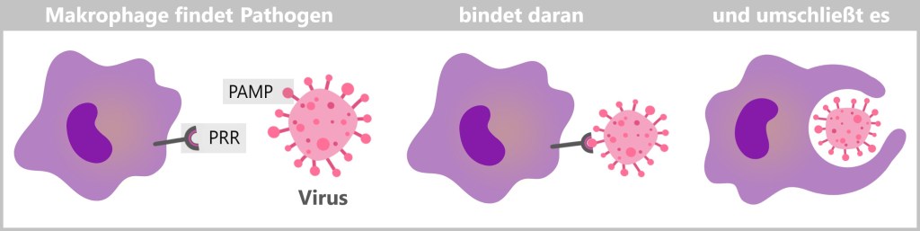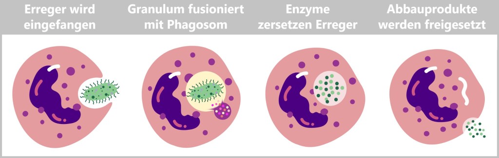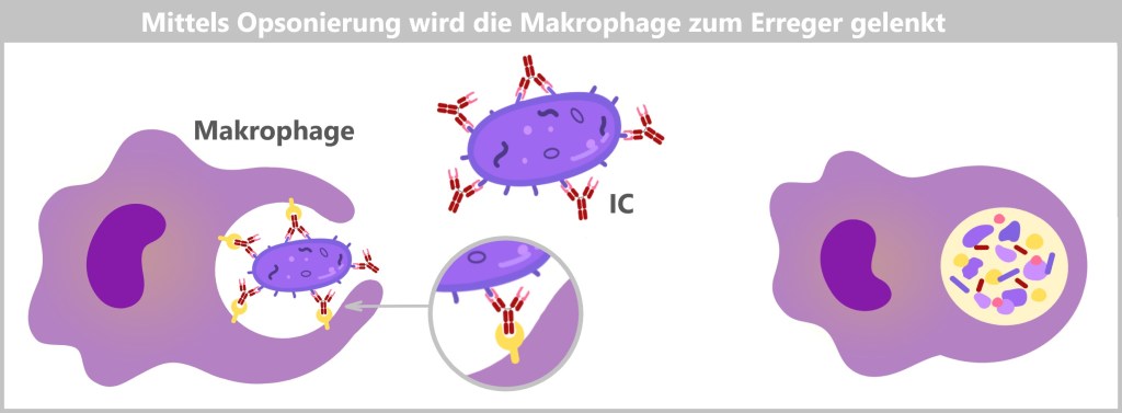 Die Makrophage erkennt den Immunkomplex (IC) durch spezialisierte Rezeptoren auf ihrer Oberfläche, die an die konstante Region der angehängten Antikörper binden. Sobald der Immunkomplex erkannt ist, verschlingt die Makrophage den gesamten Erreger und bildet ein Phagosom. Dieses Phagosom verschmilzt dann mit Lysosomen, die spezielle Verdauungsenzyme enthalten. In dem so entstandenen Phagolysosom werden sowohl der Erreger als auch die gebundenen Antikörper durch diese Enzyme abgebaut. Die abgebauten Proteine werden in kleinere Bestandteile zerlegt, die dann entweder von der Zelle wiederverwendet oder als Abfall ausgeschieden werden.