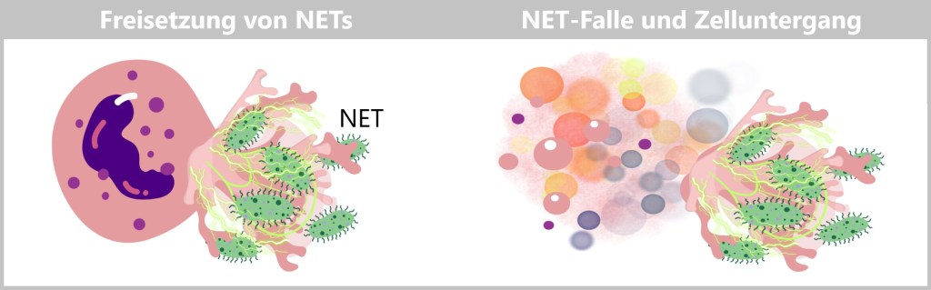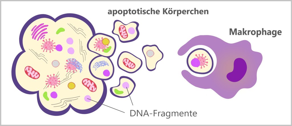 Die meisten Immunzellen, die während einer Infektion aktiviert werden, sterben nach ihrer Arbeit ab. Dies verhindert, dass der Körper durch eine Überzahl an Immunzellen geschädigt wird. Einige Zellen überleben jedoch und werden zu sogenannten Gedächtniszellen, die dem Körper helfen, zukünftige Infektionen schneller zu bekämpfen. Immunzellen können auf verschiedene Arten sterben, wie durch Apoptose (programmierter Zelltod) oder Nekroptose (eine Form von Zellzerfall). Diese Prozesse sind notwendig, um das Immunsystem nach einer Infektion zu beruhigen und wieder ins Gleichgewicht zu bringen.