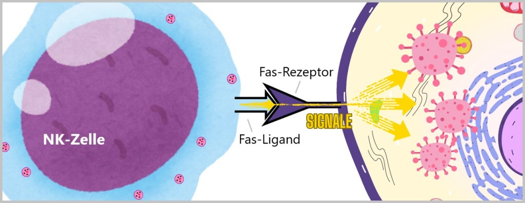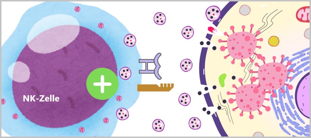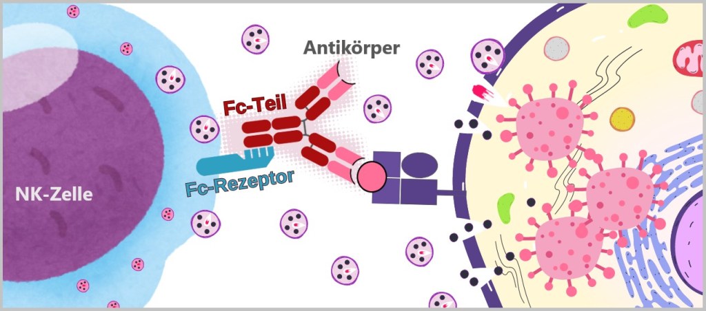 Zellzerstörung durch das Immunsystem: In einigen Fällen binden Antikörper an infizierte Zellen oder Krebszellen und markieren sie für spezielle Immunzellen, wie z. B. natürliche Killerzellen (NK-Zellen). Diese Immunzellen erkennen die markierten Zellen und zerstören sie gezielt. Dieser Vorgang wird als ADCC (antikörperabhängige zelluläre Zytotoxizität) bezeichnet.