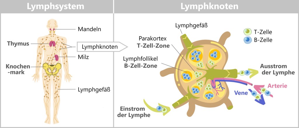 Die Rolle der Lymphknoten: Die adaptive Immunantwort erfordert, dass Krankheitserreger oder ihre Teile in die Lymphknoten gelangen (bzw. in die sekundären lymphatischen Organe), um die Produktion von Antikörpern zu starten.