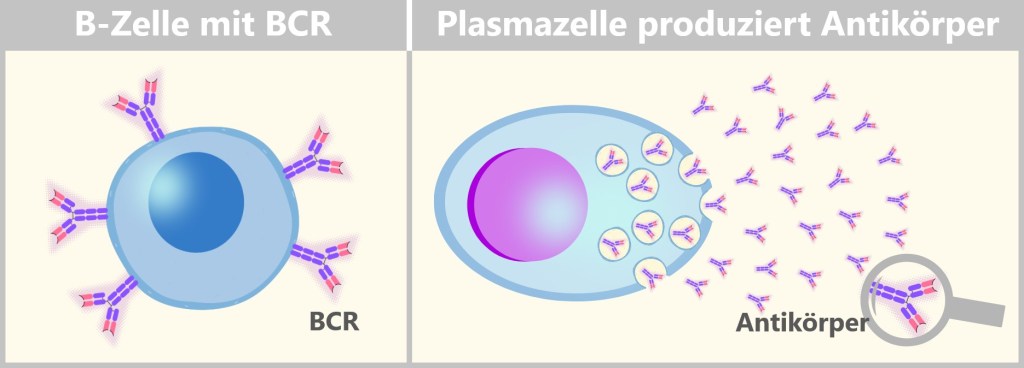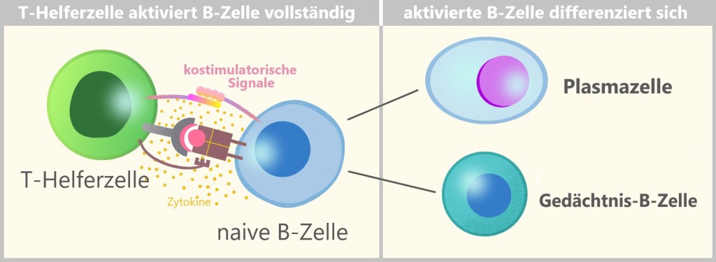 Nach ihrer Aktivierung durchlaufen B-Zellen, ähnlich wie T-Zellen, eine Phase intensiver Vermehrung. Die meisten dieser Zellen entwickeln sich zu Plasmazellen, die Antikörper produzieren, wie z.B. IgG im Blutkreislauf oder IgA an Schleimhäuten. Ein Teil der B-Zellen differenziert sich jedoch zu Gedächtnis-B-Zellen, die sich während der Affinitätsreifung und nach Abschluss der akuten Immunantwort bilden.
