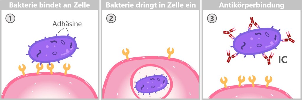 1) Bakterien heften sich mithilfe von Adhäsinen an die Zelloberfläche und beginnen die Besiedelung. 2) Einige Bakterien werden von den Zellen aufgenommen und vermehren sich in speziellen Vesikeln im Zellinneren. 3) Antikörper binden an die Adhäsine der Bakterien und verhindern so deren Anhaftung und Aufnahme in die Zellen.