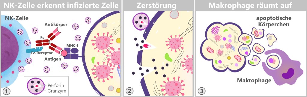 1) Eine NK-Zelle bindet an einen Antikörper, der an den Antigen-MHC-I-Komplex einer infizierten Zelle geheftet ist, und setzt zytotoxische Granula frei. 2) Die freigesetzten Substanzen dringen in die Zelle ein, durchlöchern die Membran und lösen den programmierten Zelltod (Apoptose) aus. 3) Nach dem Zelltod bleiben apoptotische Körperchen zurück, die von einer Makrophage aufgenommen und verdaut werden.