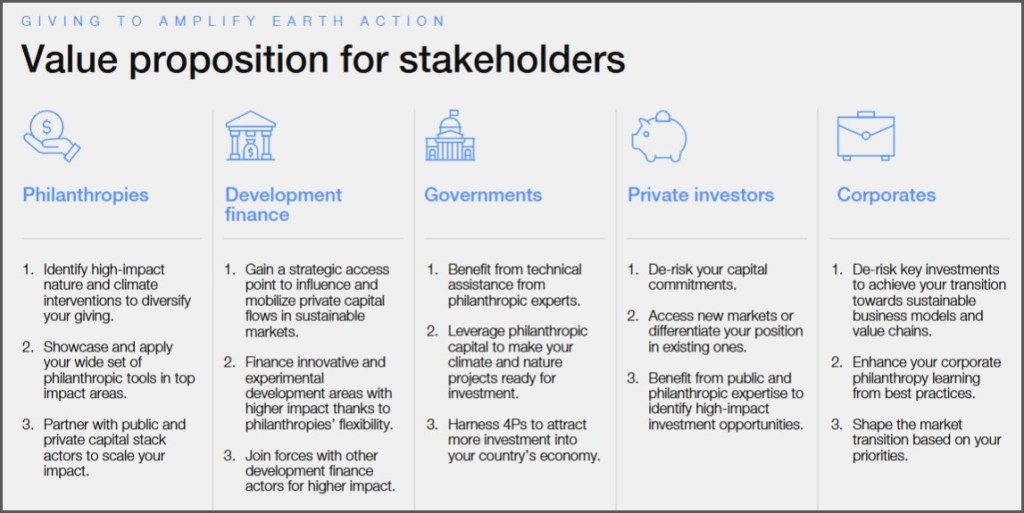 Regierungen und Finanzsektor sollen dieses Kapital nutzen, um risikoreiche Investitionen abzusichern und Projekte investitionsfähig zu machen. Gleichzeitig profitieren alle Akteure von der gebündelten public-philathropic Expertise, um hochwirksame Investitionen zu identifizieren und umzusetzen.