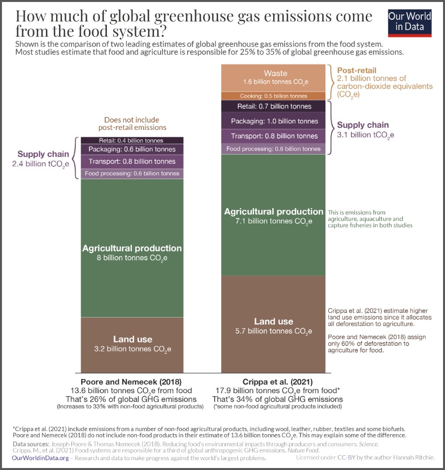 Die globale Umgestaltung der Nahrungsmittelsysteme wird maßgeblich durch die Verbindung zwischen Ernährung und Klimawandel begründet. Doch wie groß ist der Anteil der Lebensmittelproduktion an den weltweiten Treibhausgasemissionen?