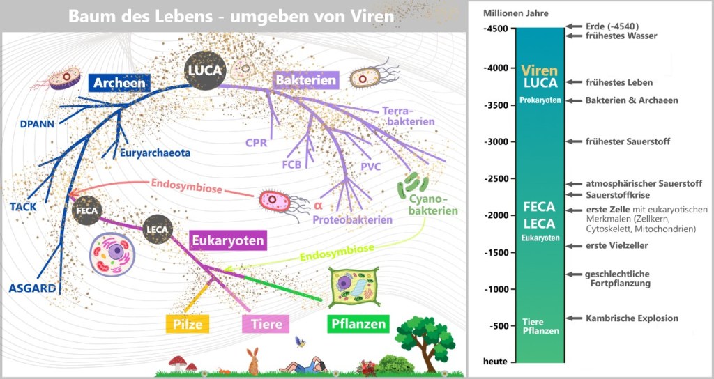 Der „Baum des Lebens“ zeigt die Abstammungslinien zellulärer Organismen – Bakterien, Archaeen und Eukaryoten – zurück bis zum gemeinsamen Vorfahren (LUCA). Die feinen Pünktchen und Bahnen symbolisieren Viren: nicht als festen Ast, sondern als diffuses Netzwerk, das den gesamten Baum durchdringt.